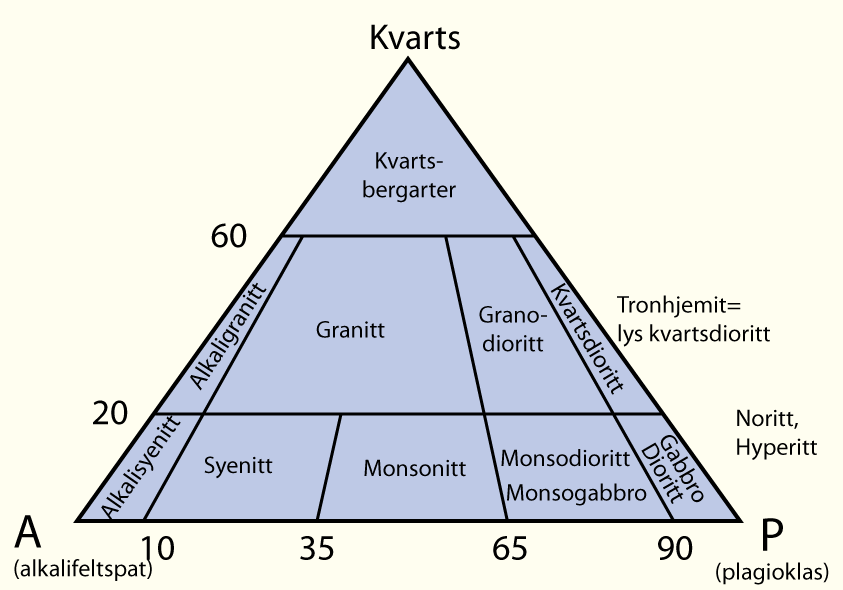 De to diagrammene under viser inndeling av dypbergarter og dagbergarter etter prosentvis mineralinnhold av tre hovedmineralene alkalifeltspat, plagioklas-feltspat og kvarts.