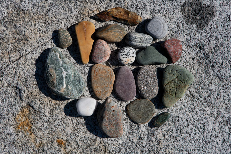 Divide 50 pebbles into three groups: Striped (with structures), dotted, and unicolored. Use the description from locality 4 and on a separate page about rocks to decide which main types of rocks they belong to!
