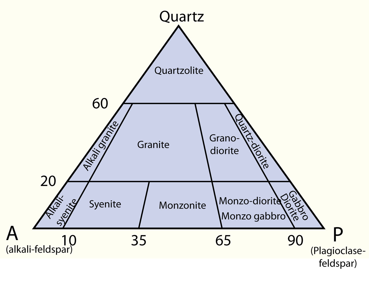 The two diagrams below show a division of magmatic rocks, plutonic above and extrusive (volcanic) below, classified after the three main minerals alkali-feldspar, plagioclase-feldspar and quartz in percentage.