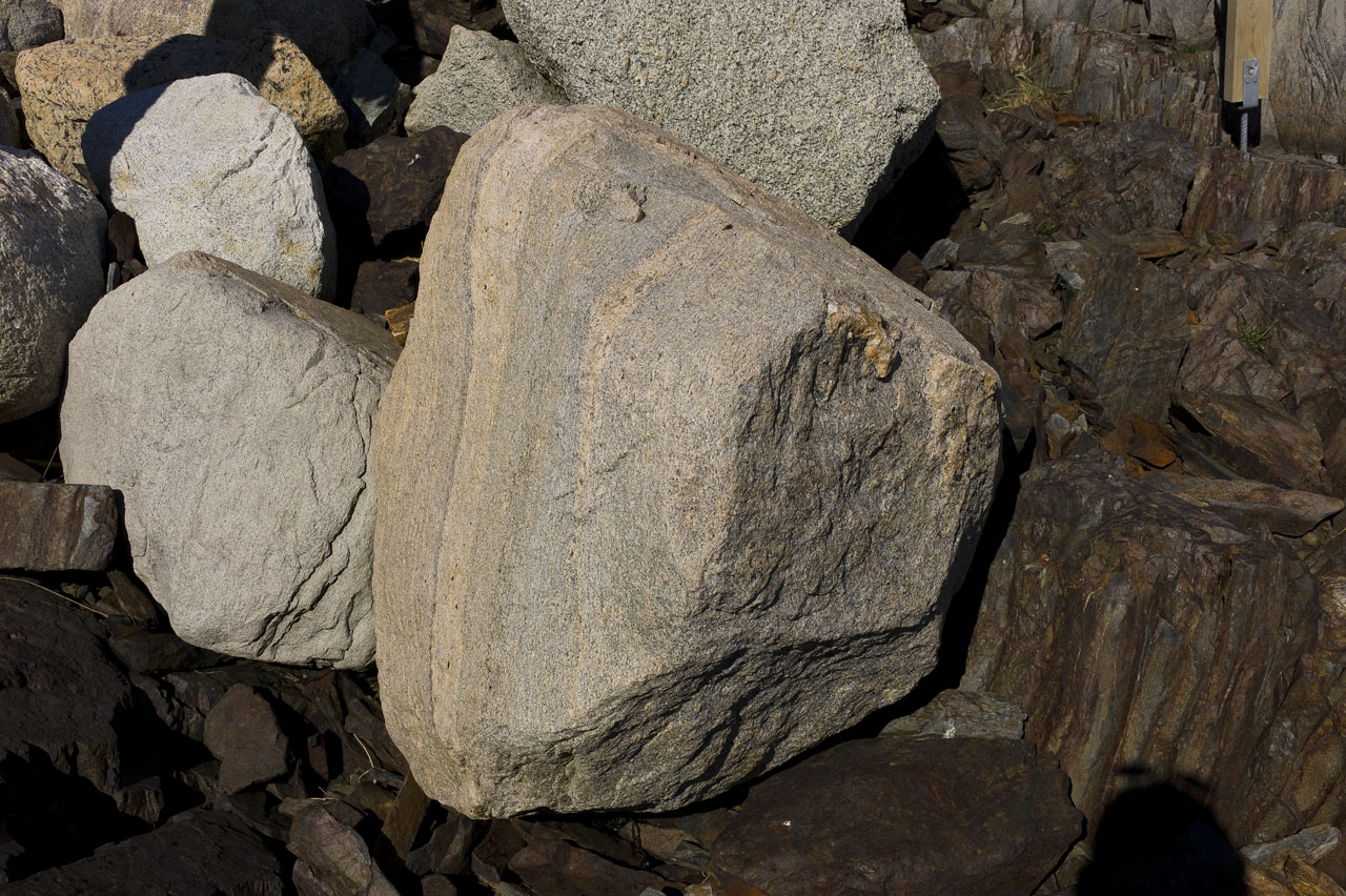 Figure 4: The greyish rocks northeast of Leka has no visible layering, but is nevertheless a typical sandstone, probably deposited at or just outside a beach. Although you can’t see it, it is probably airspace between the grains of which the rock is made up of. Sandstones are therefore common reservoir rocks, storing oil and gas, as below seabed in the North Sea and Norwegian Sea.
