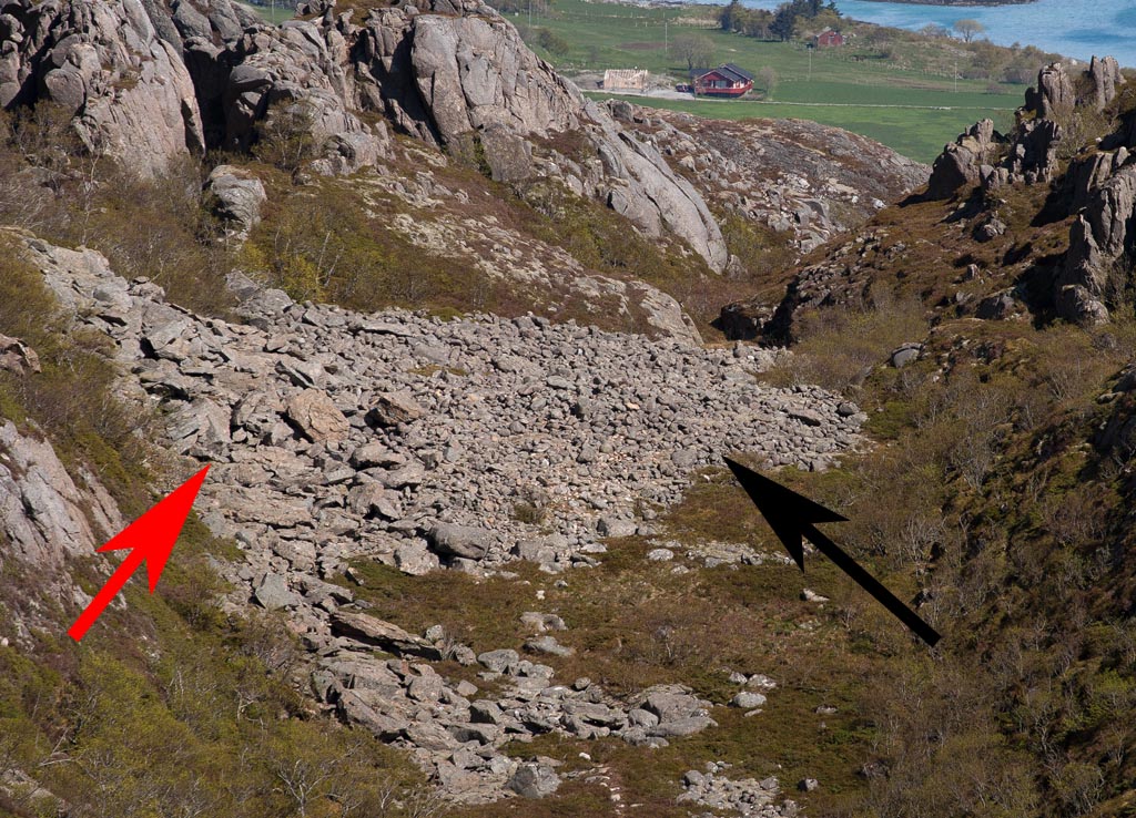 - At the red arrow the cobbles and boulders are bigger and more angular than at the black. Why?