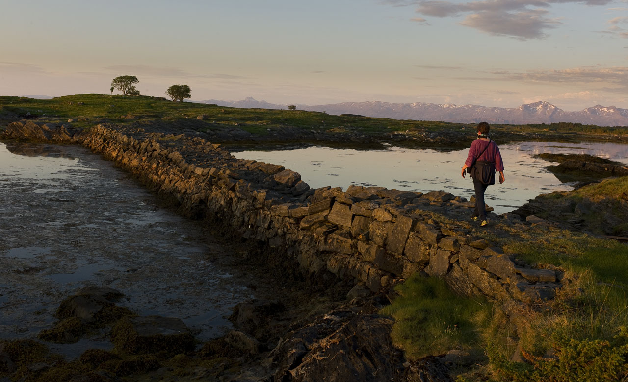 The photo above and the two below are from the strandflat-landscape along a path that runs between the village Nes and Guristraumen, a small tidal current north on the island. A walk in the beautiful cultural landscape is highly recommended.