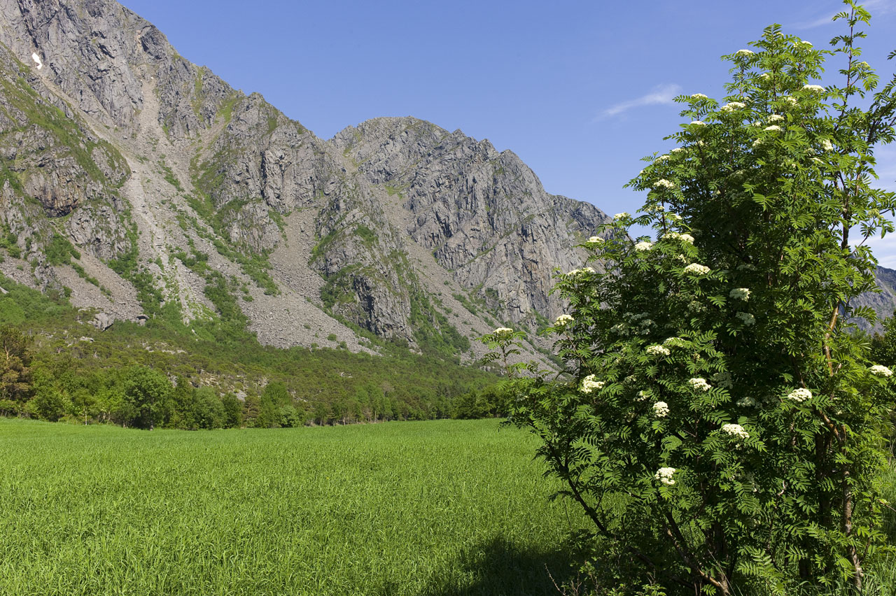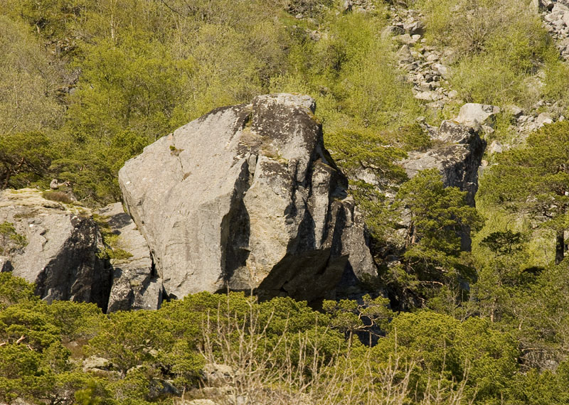 The QR-sign at the car park marks the start of a nice trail that goes all the way to Sundsvoll (locality 4), which the Geo-trail follows the first 1.5 km. The start, up to the beach in Juvika, is easy to follow along a cart road (top photo). You will see beautiful talus cones along the mountainside (see photo 2 above), formed by rockslide of grains eroded by frost weathering (see photo below). This takes place when water freezes and expands cracks in the rock.