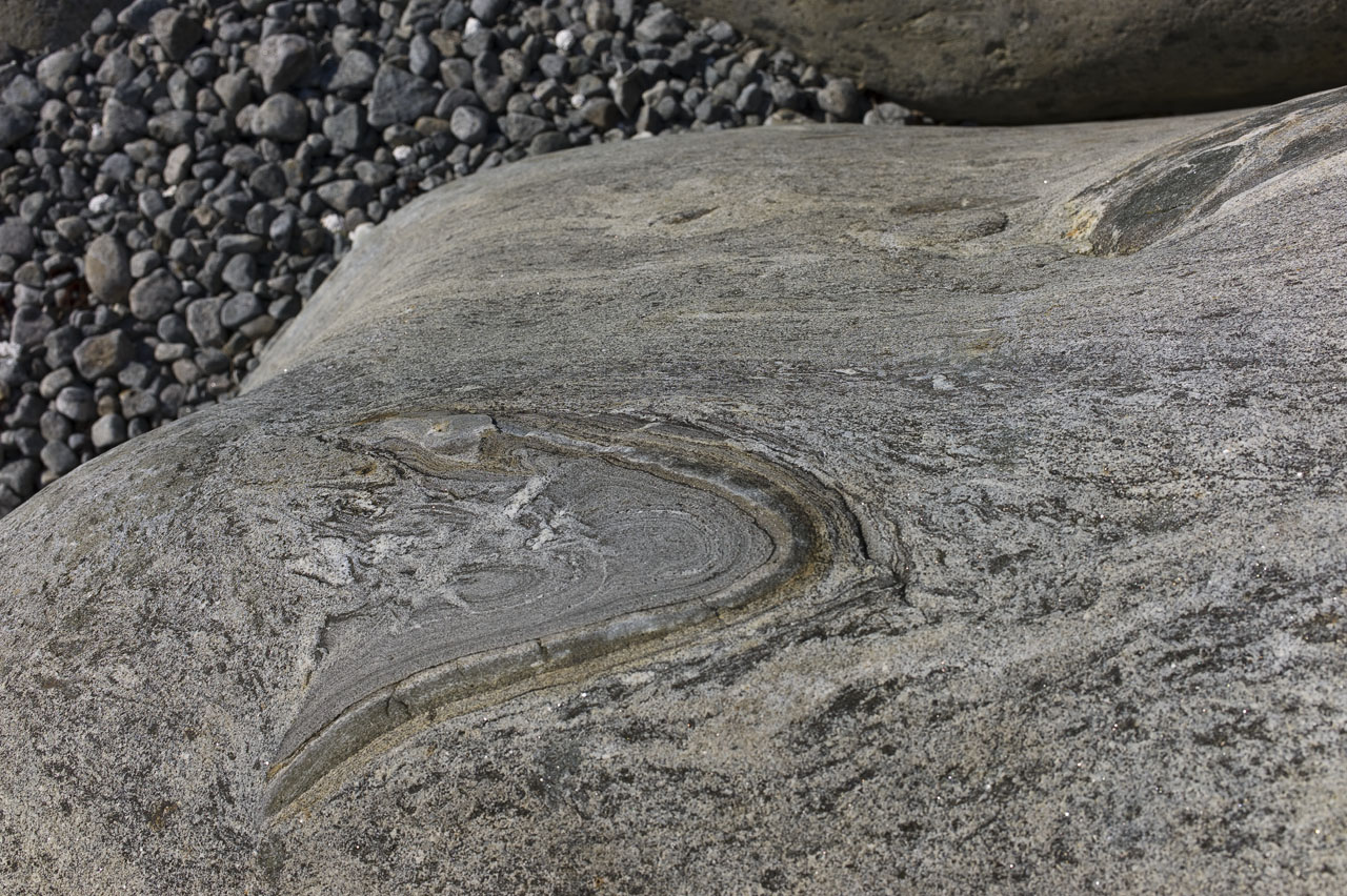 Inclusions of gneiss-fragments often have a beautiful pattern. If you are a group of people you can have a competition and see who can find the most artistic patterns! My favorite is shown in figure 3, but you can certainly find even more beautiful ones?