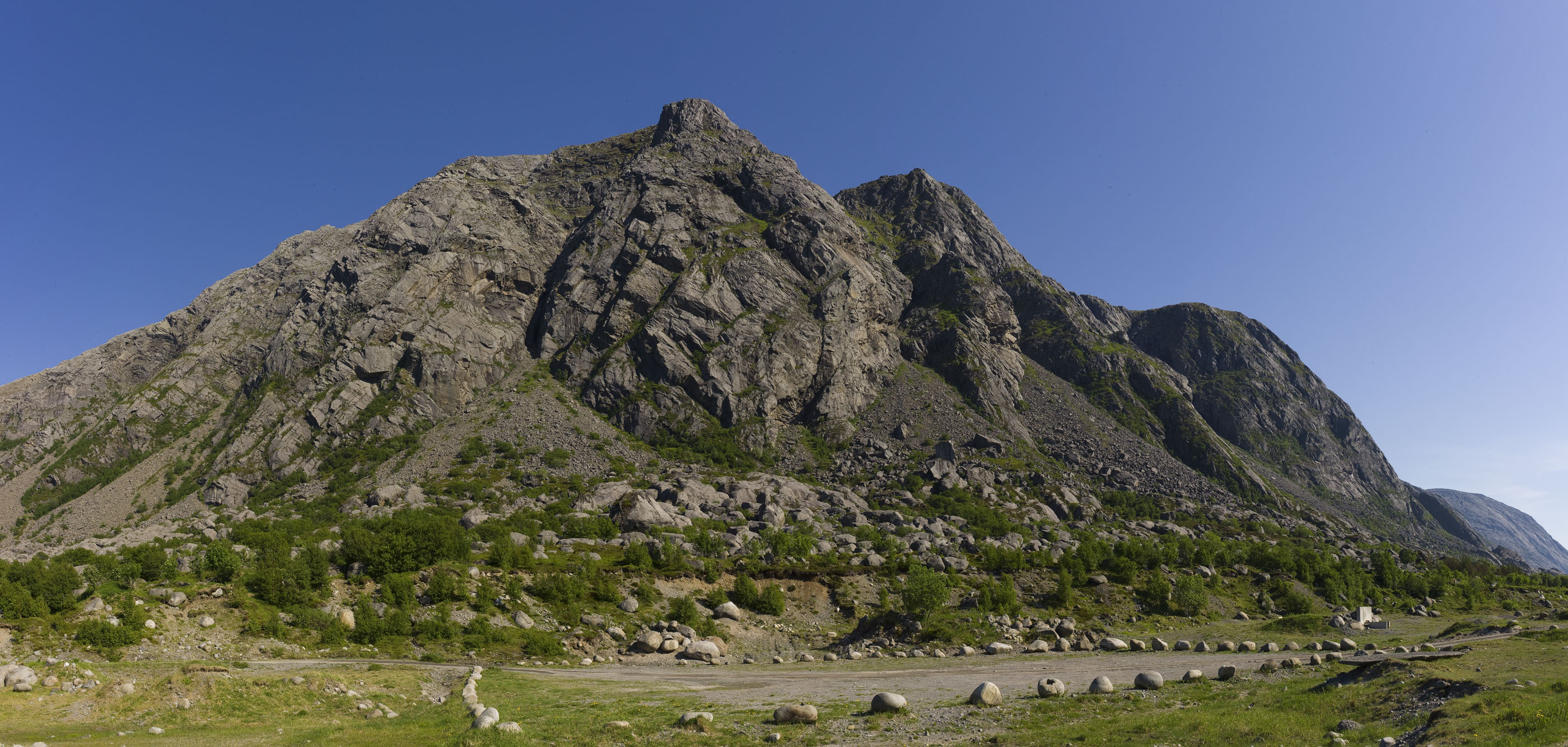 Figure 1: The intricate structures in front of the mountains Sundsvollhamran, above the cobble-beach at Sundsvoll, quickly catches your attention. Click on the image to download an enlargement of it (may take some time on a mobile). With a little imagination, do you see trolls in it? At the foot of the mountains you see much debris from rock falls, frost-weathered in the escarpment above, deposited into beautiful talus-cones.